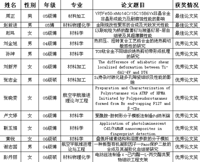材料科学与工程学院第五届研究生论坛获奖名单